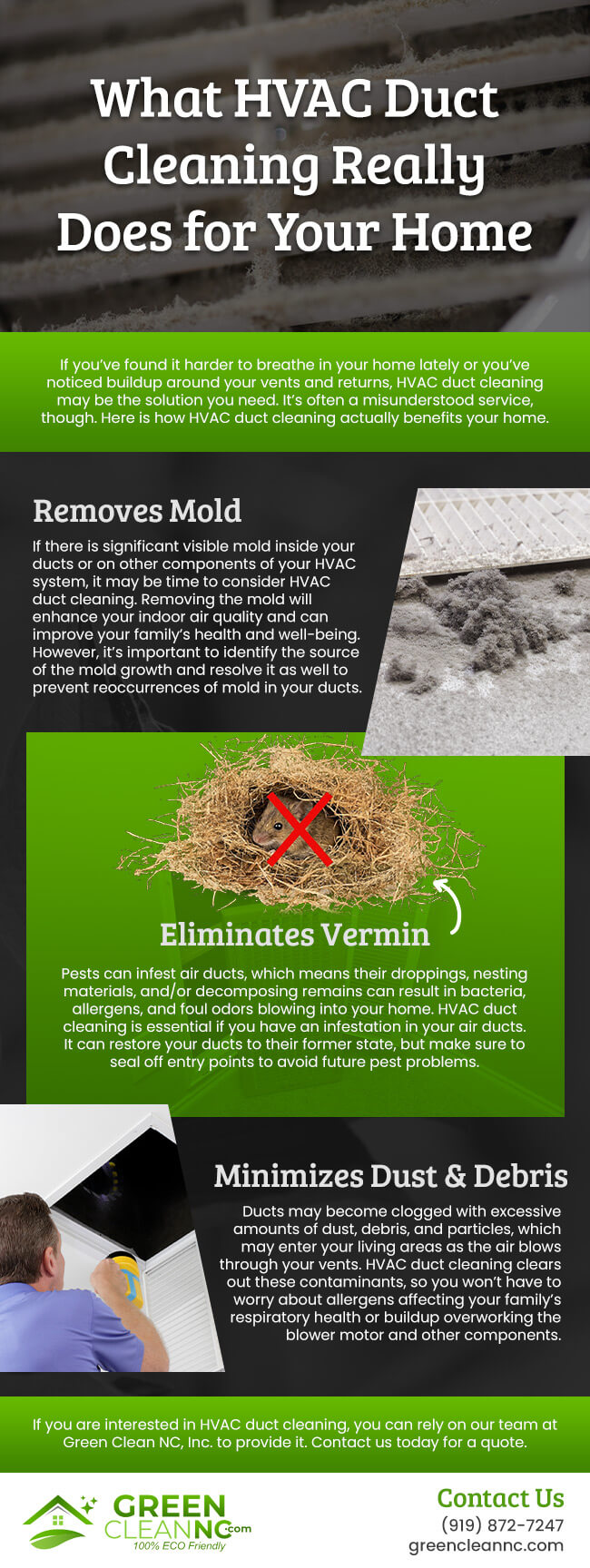 If your air ducts need cleaning, trust our team at Green Clean NC, Inc. Get $99 off and we’ll throw in free dryer vent cleaning for good measure.